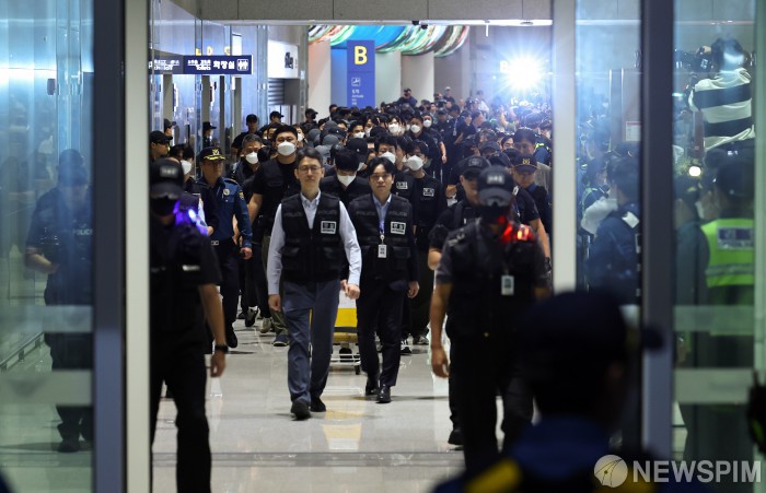 | 법무부는 '캄보디아 출국 국민 대상 취업사기 예방 안내 조치'를 라오스와 미얀마로 출국하는 국민에게까지 확대한다고 27일 밝혔다. 사진은 캄보디아에 구금돼 있던 한국인 64명이 지난 18일 오전 인천공항을 통해 송환되고 있는 모습. [사진=뉴스핌 DB] |