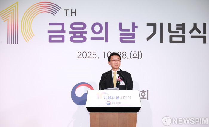 [서울=뉴스핌] 김학선 기자 = 이억원 금융위원장이 28일 서울 여의도 FKI타워 컨퍼런스센터 그랜드볼룸에서 열린 '금융의 날 기념식'에서 축사하고 있다. 2025.10.28 yooksa@newspim.com