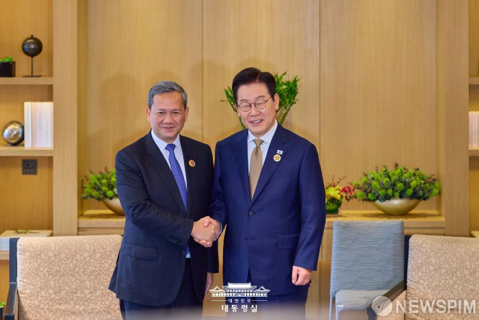 [서울=뉴스핌] 이재명 대통령과 훈 마네트 캄보디아 총리가 지난 27일 말레이시아 쿠알라룸푸르 한 호텔에서 정상회담을 앞두고 기념촬영을 하고 있다. [사진=대통령실] 2025.10.28 photo@newspim.com