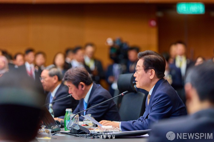 [서울=뉴스핌] 이재명 대통령이 지난 27일 말레이시아 쿠알라룸푸르에서 열린 제28차 아세안+3 정상회의에서 개회사를 하고 있다. [사진=대통령실] 2025.10.28 photo@newspim.com