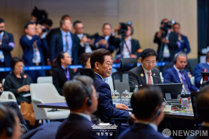 [서울=뉴스핌] 이재명 대통령이 지난 27일 말레이시아 쿠알라룸푸르에서 열린 제28차 아세안+3 정상회의에 자리하고 있다. [사진=대통령실] 2025.10.28 photo@newspim.com