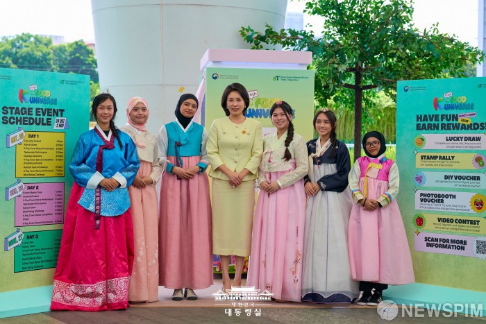 [서울=뉴스핌] 김혜경 여사가 지난 27일 말레이시아 쿠알라룸푸르의 K-푸드 팝업스토어를 찾아 관계자들과 기념촬영을 하고 있다. [사진=대통령실] 2025.10.28 photo@newspim.com
