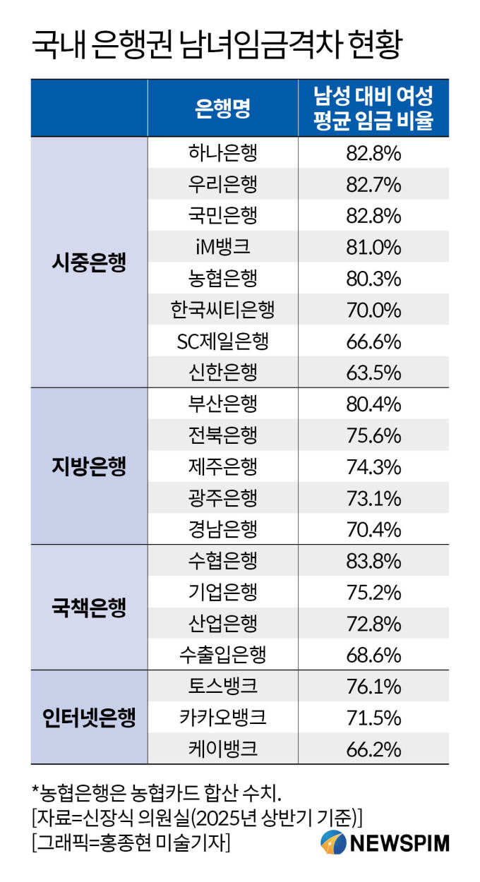 시중은행 중에서는 하나은행 여성 임금 비율이 82.8%로 가장 높았고 우리은행 82.7%, 국민은행 82.8%, iM뱅크 81.0%, 농협은행(농협카드 포함) 80.3% 등 5곳이 80%를 넘는 등 남녀 임금 격차가 비교적 양호한 것으로 조사됐다.
