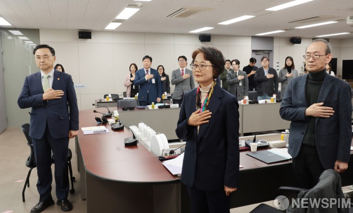 [서울=뉴스핌] 이길동 기자 =차정인 국가교육위원회 위원장(왼쪽)이 28일 서울 종로구 정부서울청사에서 열린 국가교육위 고교교육 특별위원회 위촉식 및 1차 회의에서 참석자들과 국기에 경례하고 있다.2025.10.28gdlee@newspim.com