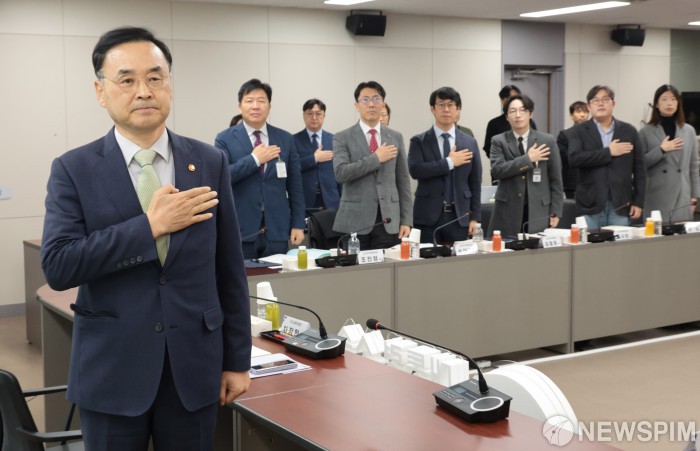 [서울=뉴스핌] 이길동 기자 =차정인 국가교육위원회 위원장이 28일 서울 종로구 정부서울청사에서 열린 국가교육위 고교교육 특별위원회 위촉식 및 1차 회의에서 국기에 경례하고 있다.2025.10.28gdlee@newspim.com