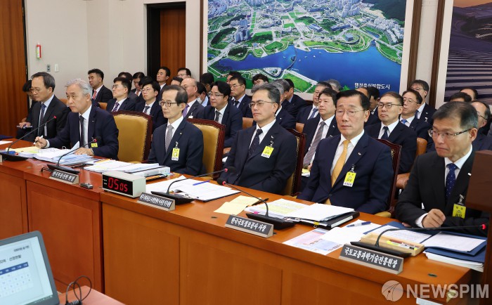 | [서울=뉴스핌] 정일구 기자 = 한동민 대한건설기계안전관리원 원장(왼쪽부터), 윤명규 주택도시보증공사 사장 직무대행, 손태락 한국부동산원 원장, 곽진규 제주국제자유도시개발센터 이사장 직무대행, 어명소 한국국토정보공사 사장, 김정희 국토교통과학기술진흥원 원장이 23일 서울 여의도 국회 국토교통위원회에서 열린 한국부동산원 등에 대한 국정감사에 출석해 있다. 2025.10.23 mironj19@newspim.com |