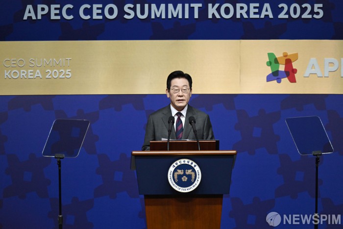 [서울=뉴스핌] 이재명 대통령이 29일 오전 경북 경주 화백컨벤션센터에서 열린 2025년 APEC CEO 서밋에서 특별연설을 하고 있다. [사진=APEC 2025 KOREA & 연합뉴스] 2025.10.29 photo@newspim.com
