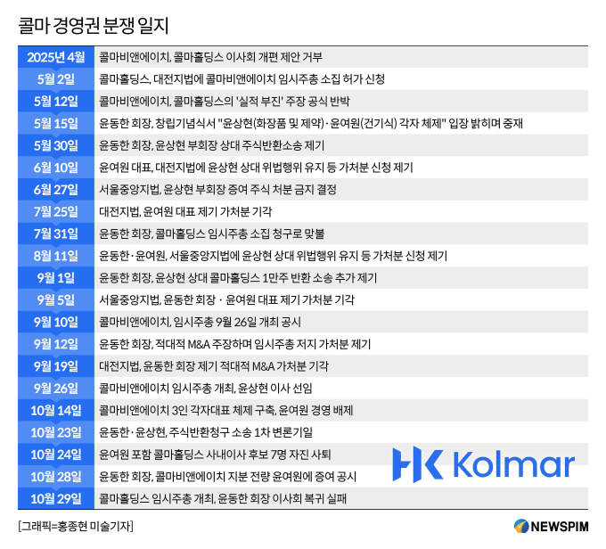 [서울=뉴스핌] 김신영 기자 = 콜마그룹 경영권 분쟁이 장남 윤상현 부회장의 승리로 굳혀지는 모습이다. 윤 부회장은 지난달 열린 콜마비앤에이치 임시주주총회에 이어 콜마홀딩스 임시주총에서도 승기를 잡으며 경영권을 장악했다. 다만 창업주 윤동한 콜마그룹 회장이 제기한 주식반환청구 소송은 현재 진행형으로 부자 간 갈등은 지속될 전망이다.