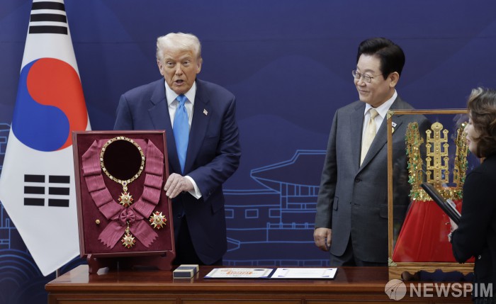 [서울=뉴스핌] 이재명 대통령이 29일 경북 경주박물관에서 도널드 트럼프 미국 대통령에게 한국 최고 훈장인 무궁화 대훈장을 수여하고 천마총 금관 모형을 선물했다. 트럼프 대통령이 훈장을 들고 발언을 하고 있다. [사진=APEC 2025 KOREA & 연합뉴스] 2025.10.29 photo@newspim.com