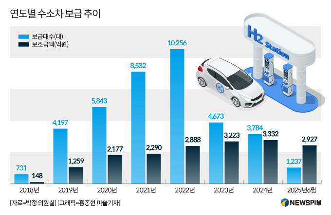 [세종=뉴스핌] 최영수 선임기자 = 정부가 적극 추진하고 있는 수소차 보급이 4년째 '내리막'이라는 지적이 나왔다.
