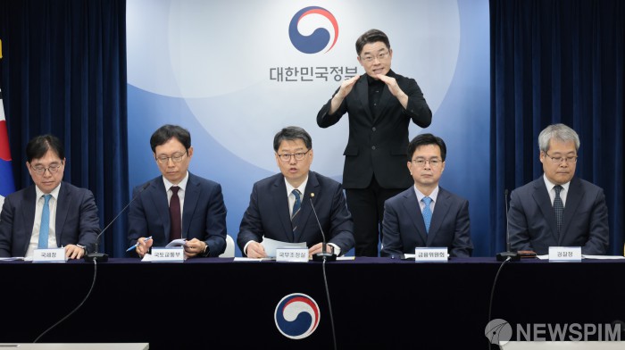 [서울=뉴스핌] 이길동 기자 = 김용수 국무조정실 국무2차장이 30일 오전 서울 종로구 정부서울청사에서 부동산 불법행위 대응 관계 부처 합동브리핑을 하고 있다. 왼쪽부터 오상훈 국세청 자산과세국장, 김규철 국토교통부 주택토지실장, 김용수 국무2차장, 신진창 금융위원회 사무처장, 홍석기 경찰청 수사국장. 2025.10.30 gdlee@newspim.com