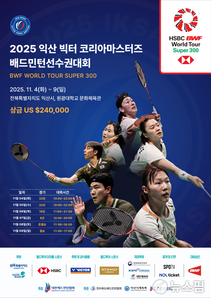 [익산=뉴스핌] 이백수 기자 = 전북 익산시는 내달 4일부터 9일까지 원광대학교 문화체육관에서 '2025 익산 빅터 코리아마스터즈 배드민턴선수권대회'가 개최된다고 30일 밝혔다.