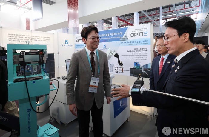 [경주=뉴스핌] 윤창빈 기자 = 30일 오전 경주엑스포대공원에 마련된 2025 경주 APEC K-테크쇼케이스 전시관을 찾은 김민석 국무총리가 첨단미래산업관을 둘러보고 있다. 2025.10.30 pangbin@newspim.com