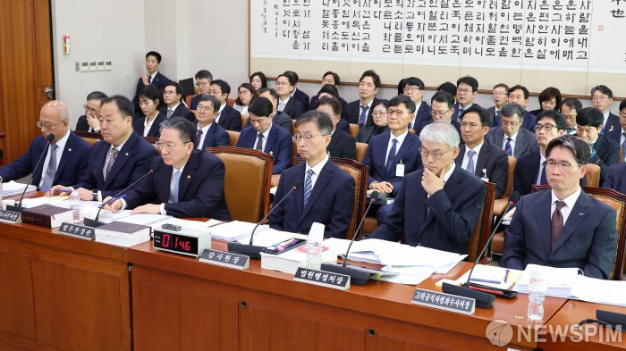 [서울=뉴스핌] 정일구 기자 = 조원철 법제처장(왼쪽부터), 손인혁 헌법재판소 사무처장, 정성호 법무부 장관, 최재해 감사원장, 천대엽 법원행정처장, 오동운 고위공직자범죄수사처장이 30일 오전 서울 여의도 국회 법제사법위원회에서 열린 법무부 등에 대한 종합감사에 출석해 있다. 2025.10.30 mironj19@newspim.com