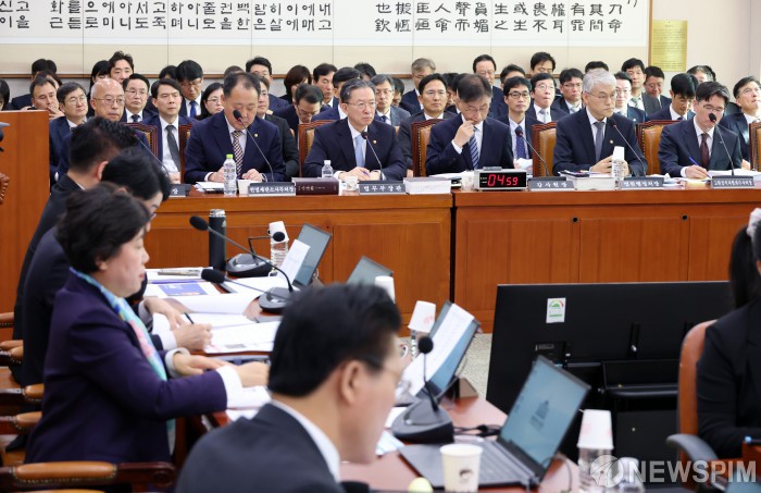 [서울=뉴스핌] 정일구 기자 = 조원철 법제처장(왼쪽부터), 손인혁 헌법재판소 사무처장, 정성호 법무부 장관, 최재해 감사원장, 천대엽 법원행정처장, 오동운 고위공직자범죄수사처장이 30일 오전 서울 여의도 국회 법제사법위원회에서 열린 법무부 등에 대한 종합감사에 출석해 있다. 2025.10.30 mironj19@newspim.com