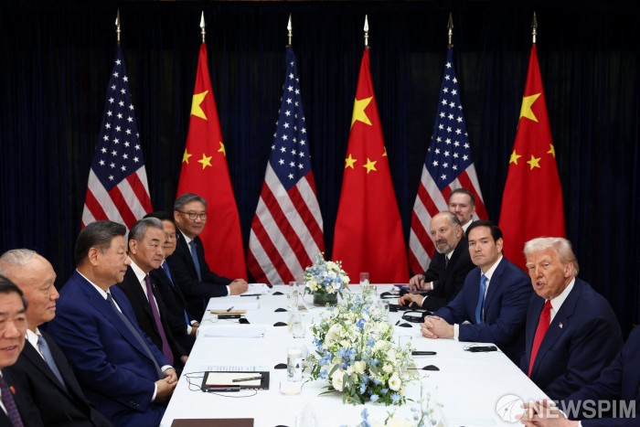 [부산 로이터=뉴스핌] 도널드 트럼프 미국 대통령이 30일 부산 김해국제공항 나래마루에서 열린 시진핑 미중 정상회담에서 발언을 하고 있다. 2025.10.30 photo@newspim.com