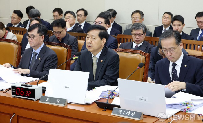 [서울=뉴스핌] 정일구 기자 = 구윤철 부총리 겸 기획재정부 장관(가운데), 이형일 제1차관(오른쪽), 임기근 제2차관이 30일 오전 서울 여의도 국회 개획재정위원회에서 열린 기획재정부 등에 대한 종합감사에 출석해 있다. 2025.10.30 mironj19@newspim.com