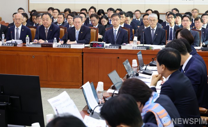 | [서울=뉴스핌] 정일구 기자 = 조원철 법제처장(왼쪽부터), 손인혁 헌법재판소 사무처장, 정성호 법무부 장관, 최재해 감사원장, 천대엽 법원행정처장, 오동운 고위공직자범죄수사처장이 30일 오전 서울 여의도 국회 법제사법위원회에서 열린 법무부 등에 대한 종합감사에 출석해 있다. 2025.10.30 mironj19@newspim.com |