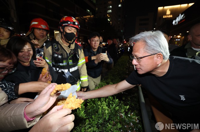 시민들에게 치킨 나눠주는 젠슨 황 엔비디아 CEO