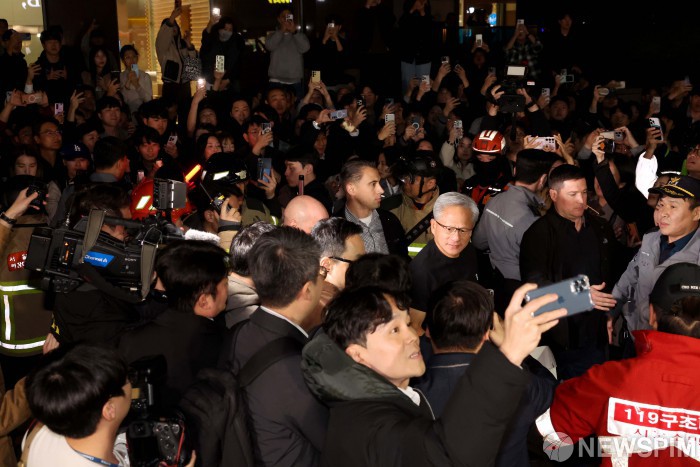 [서울=뉴스핌] 최지환 기자 = 젠슨 황 엔비디아 최고경영자(CEO)가 30일 서울 강남구 삼성동의 한 치킨집에서 이재용 삼성전자 회장과 정의선 현대차그룹 회장과의 '치맥' 회동 중 시민들에게 치킨을 나눠 준 뒤 돌아가고 있다. 2025.10.30 choipix16@newspim.com
