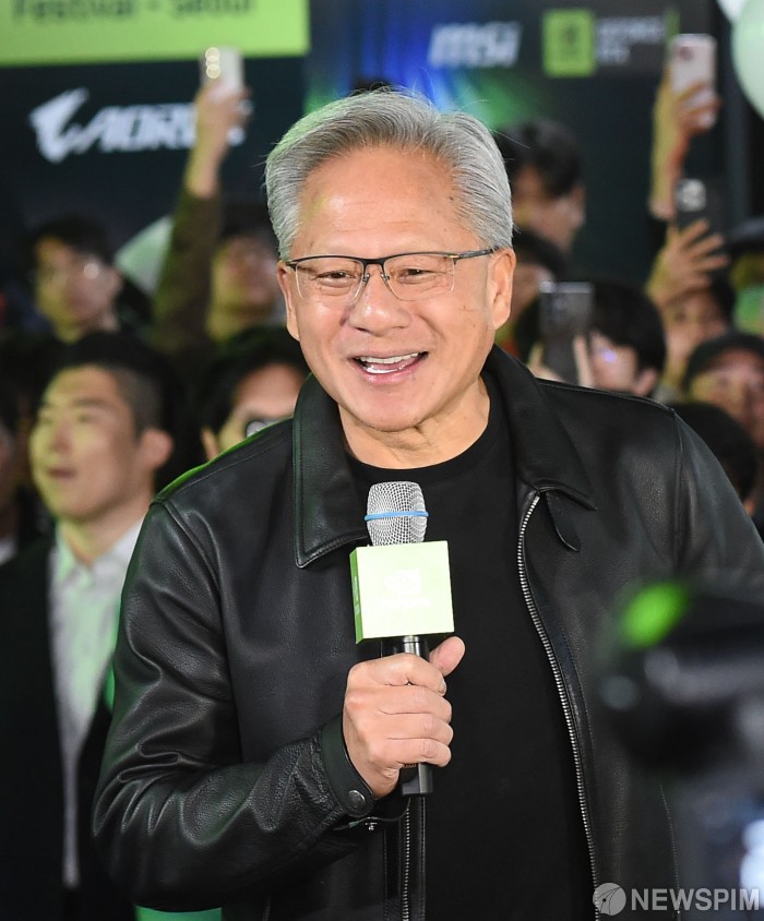 [서울=뉴스핌] 최지환 기자 = 젠슨 황 엔비디아 최고경영자(CEO)가 30일 오후 서울 강남구 삼성동 코엑스 광장에서 열린 지포스 게이머 페스티벌에서 한국 팬들에게 인사를 하고 있다. 2025.10.30 choipix16@newspim.com