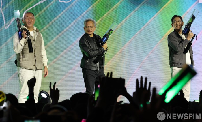 [서울=뉴스핌] 최지환 기자 = 젠슨 황 엔비디아 최고경영자, 이재용 삼성전자 회장, 정의선 현대차그룹 회장이 30일 오후 서울 강남구 코엑스 K-POP 광장에서 열린 지포스 게이머 페스티벌에서 팬들을 위한 선물이 담긴 퍼포먼스건을 들고 있다. 2025.10.30 choipix16@newspim.com