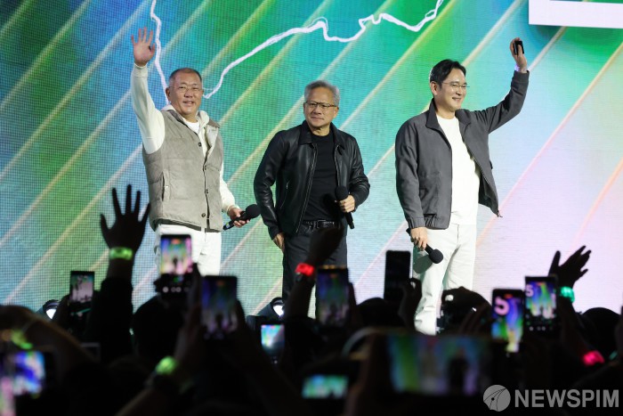 [서울=뉴스핌] 최지환 기자 = 젠슨 황 엔비디아 최고경영자, 이재용 삼성전자 회장, 정의선 현대차그룹 회장이 30일 오후 서울 강남구 코엑스 K-POP 광장에서 열린 지포스 게이머 페스티벌에 참석해 있다. 2025.10.30 choipix16@newspim.com