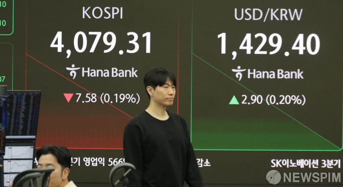 | [서울=뉴스핌] 양윤모 기자 = 경주 APEC 정상회의 공식 개막일인 31일 오전 코스피가 전장 종가보다 7.58 포인트(0.19%) 하락하며 4079.31로, 코스닥은 3.40 포인트(0.38%) 상승한 894.26으로 장을 시작한 가운데, 서울 중구 하나은행 딜링룸에서 직원들이 업무를 보고 있다. 서울외환시장에서 달러/원 환율은 전장 대비 2.90원 상승한 1429.40원에 거래를 시작했다. 2025.10.31 yym58@newspim.com |