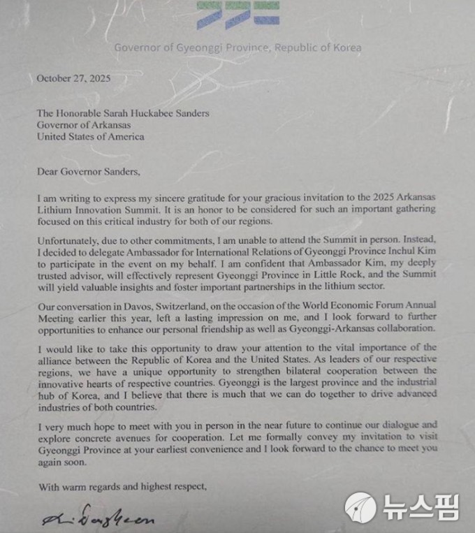 김 지사는 "샌더스 주지사로부터 특별한 초청장을 받았고, 이를 계기로 아칸소주와 경기도의 실질적 협력 기반이 넓어졌다"고 강조했다.