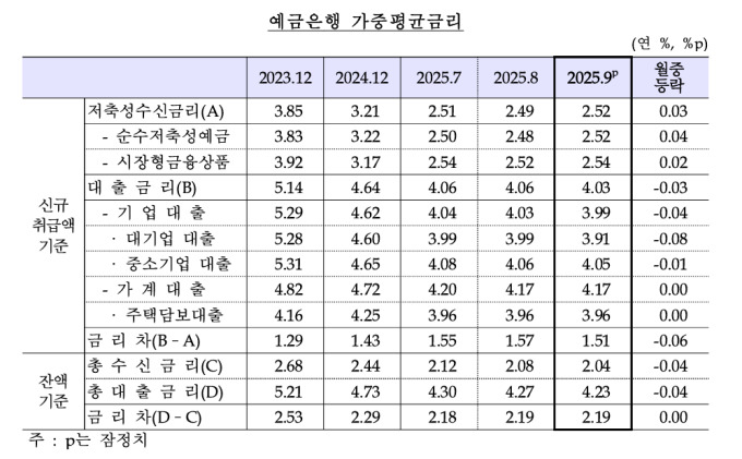 한국은행은 31일 '9월 금융기관 가중평균금리' 자료에서 9월중 예금은행의 저축성수신금리(신규취급액 기준)는 연 2.52%로 전월대비 0.03%포인트(p) 상승했으며 대출금리는 연 4.03%로 전월대비 0.03%p 하락했다고 밝혔다.