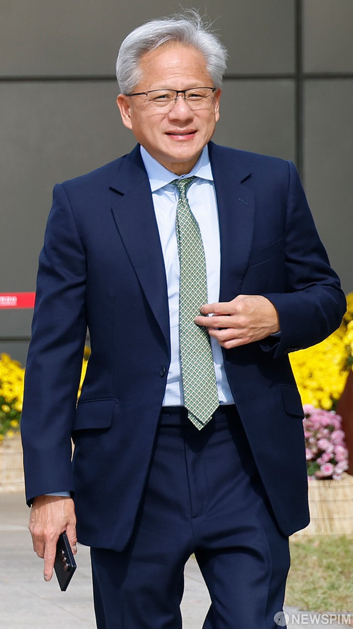 [포항=뉴스핌] 류기찬 기자 = 아시아태평양경제협력체(APEC) 정상회의에 참석하는 젠슨 황 엔비디아 최고경영자(CEO)가 31일 오후 경북 포항시 포항경주공항으로 입국해 차량으로 이동하던 중 환영객들에게 인사를 하기 위해 발걸음을 옮기고 있다. 2025.10.31 ryuchan0925@newspim.com