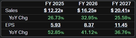 올해 연간 전망은 대폭 상향한 한편 2026년은 성장 가속을 예고했다. 올해 연간 매출액 전망치는 종전 115억5000만달러에서 122억달러로 상향했고 주당순이익은 5.5달러에서 5.9달러로 올렸다. 작년보다 각각 26%, 52% 증가를 상정한 수치다. 내년 매출액과 이익은 각각 160억달러와 8.2달러로 31%와 39% 증가율을 상정했다.