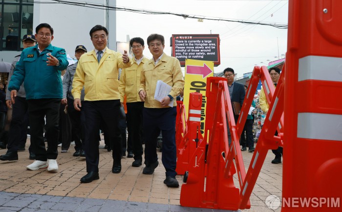 [서울=뉴스핌] 김학선 기자 = 핼러윈 데이인 31일 윤호중 행정안전부 장관이 인파 밀집 관리 대상 지역인 서울 마포구 홍대 관광특구 거리를 점검하고 있다. 2025.10.31 yooksa@newspim.com