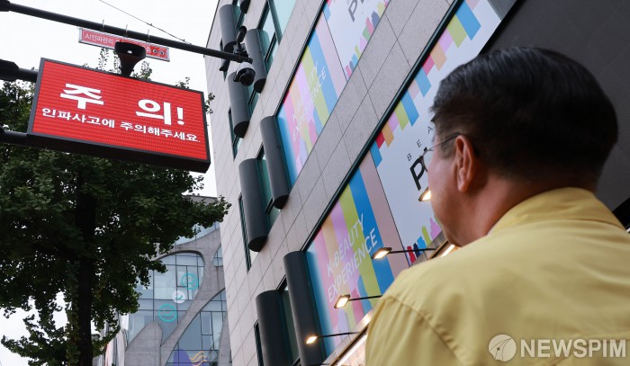 [서울=뉴스핌] 김학선 기자 = 핼러윈 데이인 31일 윤호중 행정안전부 장관이 인파 밀집 관리 대상 지역인 서울 마포구 홍대 관광특구 거리를 점검하고 있다. 2025.10.31 yooksa@newspim.com