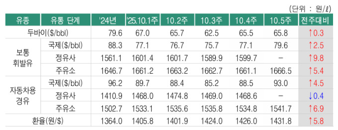 1일 한국석유공사 유가정보서비스 오피넷에 따르면 이번주(10월 5주) 주유소 휘발유 판매가격은 전주 대비 5.4원 상승한 리터당 1666.5원, 경유 판매가격은 7.0원 상승한 리터당 1541.7원으로 나타났다.
