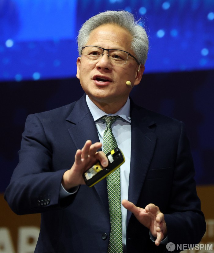[서울=뉴스핌] 젠슨 황 엔비디아 최고경영자(CEO)가 31일 경북 경주 예술의전당에서 열린 아시아태평양경제협력체(APEC) 최고경영자(CEO) 서밋에서 특별세션 기조연설하고 있다. [사진=APEC 2025 KOREA & 연합뉴스] 2025.10.31 photo@newspim.com