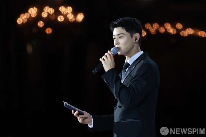 [서울=뉴스핌] 군 복무중인 배우 차은우가 31일 경북 경주의 한 호텔에서 열린 APEC 정상회의 환영 만찬에서 사회를 보고 있다. [사진=APEC 2025 KOREA & 연합뉴스] 2025.10.31 photo@newspim.com