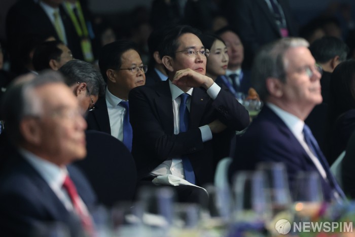 [서울=뉴스핌] 이재용 삼성전자 회장이 31일 경북 경주의 한 호텔에서 열린 APEC 정상회의 환영 만찬에서 문화공연을 관람하고 있다. [사진=APEC 2025 KOREA & 연합뉴스] 2025.10.31 photo@newspim.com