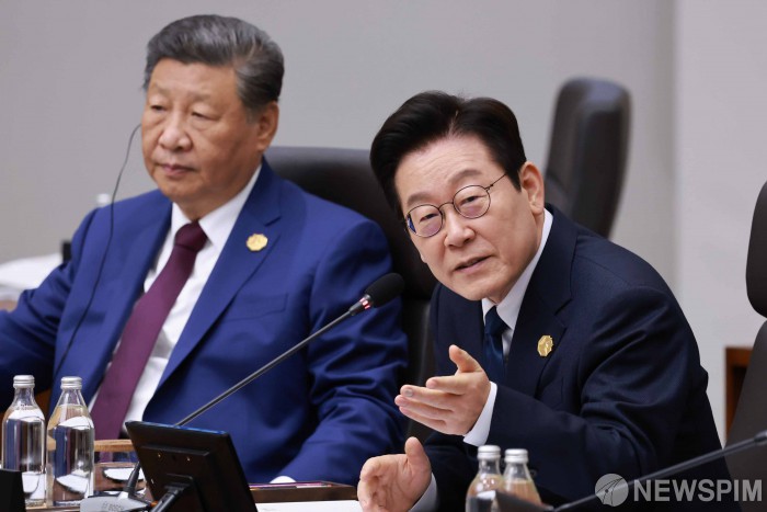 [서울=뉴스핌] 이재명 대통령이이 1일 경주화백컨벤션센터(HICO)에서 열린 2025 아시아태평양경제협력체(APEC) 정상회의 제2세션을 주재하고 있다. [사진=APEC 2025 KOREA & 연합뉴스] 2025.11.01 photo@newspim.com