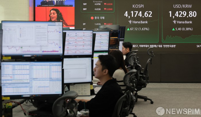 [서울=뉴스핌] 이길동 기자 = 3일 오전 서울 중구 하나은행 딜링룸에 코스 지수가 표시되어 있다. 이날 코스피는 전 거래일보다 15.86p(0.39%) 오른 4123.36에 코스닥 지수는 전 거래일보다 5.77p(0.64%) 오른 906.19에 거래를 시작했다. 서울 외환시장에서 달러/원 환율은 전거래일 대비 3.8원 상승한 1428.2원에 개장했다.2025.11.03.gdlee@newspim.com