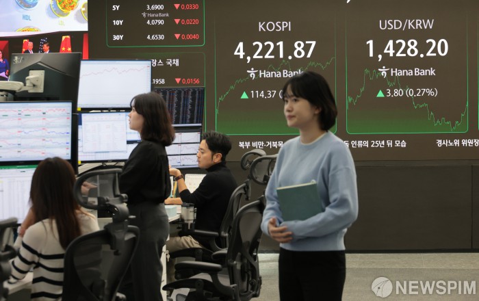 [서울=뉴스핌] 이길동 기자 = 3일 서울 중구 하나은행 딜링룸에 코스피 지수및 달러/원 환율이 표시되어 있다. 이날 코스피는 전 거래일보다 114.37p(2.78%) 오른 4,221.87에 코스닥 지수는 전 거래일보다 14.13p(01.57%) 오른 914.55에 거래를 마감했다. 서울 외환시장에서 달러/원 환율은 전 거래일 주간거래 종가 대비 3.50원 상승한 1,427.90원에 주간 거래를 마감했다.2025.11,03 gdlee@newspim.com