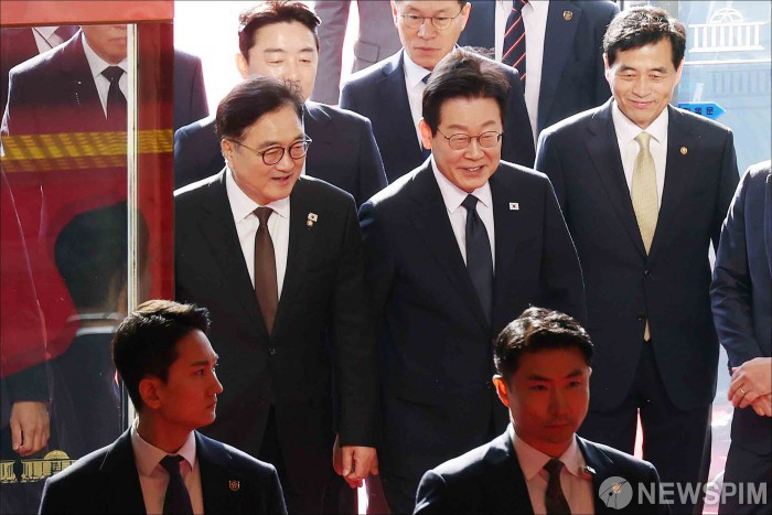 [서울=뉴스핌] 윤창빈 기자 = 이재명 대통령이 4일 오전 서울 여의도 국회 본청에서 열린 국회 본회의에서 2026년도 예산안 및 기금운용계획안 대통령 시정연설을 위해 우원식 국회의장의 영접을 받으며 국회 본청을 들어서고 있다. 2025.11.04 pangbin@newspim.com