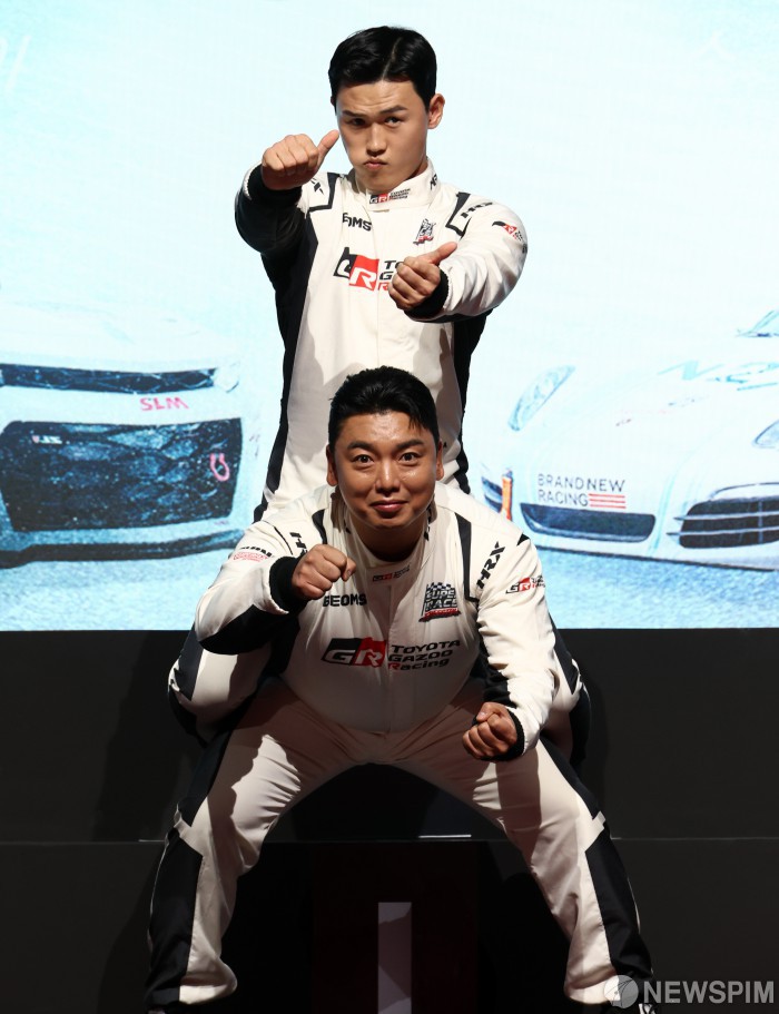 [서울=뉴스핌] 최지환 기자 = 팀 토요타 가주 레이싱 최광빈 선수, 개그맨 곽범이 5일 오후 서울 중구 웨스틴조선 서울에서 열린 슈퍼레이스 프리스타일 제작발표회에서 포즈를 취하고 있다. 오는 7일 첫 공개를 앞둔 티빙 오리지널 슈퍼레이스 프리스타일은 '2025 오네 슈퍼레이스 챔피언십'을 무대로 국내 촤정상급 드라이버들이 우승을 향해 도전하는 카레이싱 예능이다. 2025.11.05 choipix16@newspim.com