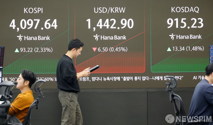 [서울=뉴스핌] 류기찬 기자 = 6일 오전 서울 중구 하나은행 딜링룸 전광판에 코스피, 달러/원, 코스닥 지수가 표시되고 있다. 이날 코스피 지수는 전장 대비 88.04포인트(2.20%) 오른 4092.46에, 코스닥 지수는 13.54포인트(1.50%) 오른 915.43에 장을 시작했다. 달러/원 환율은 전장보다 7.40원 내린 1442.00으로 출발했다. 2025.11.06. ryuchan0925@newspim.com