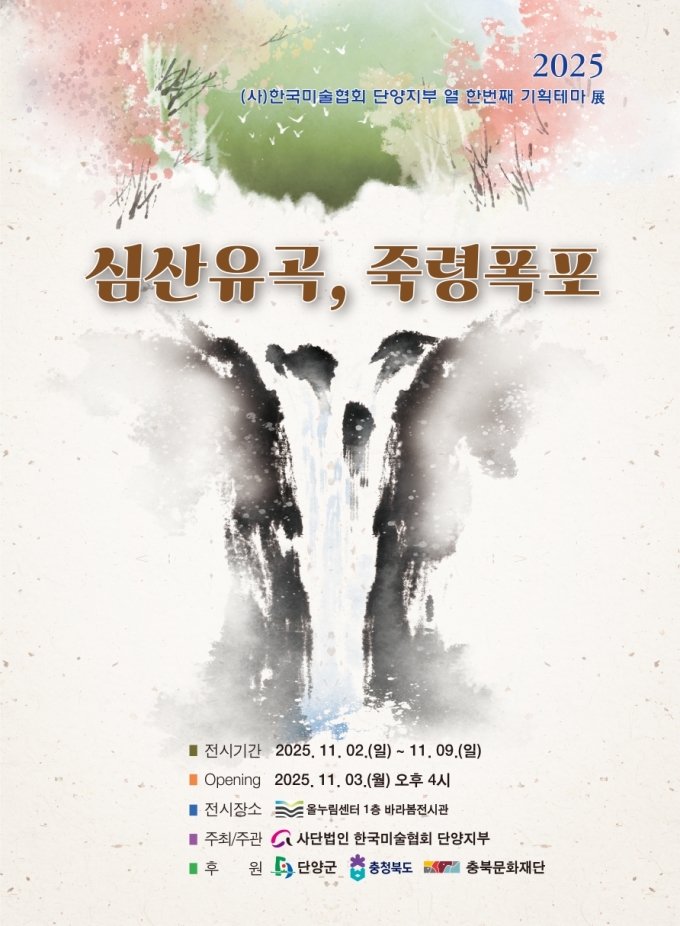 [단양=뉴스핌] 조영석 기자 =한국미술협회 단양지부가 단양의 자연과 예술의 조화를 주제로 한 기획테마전 '심산유곡-죽령폭포'를 개최한다.