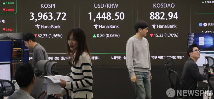 [서울=뉴스핌] 양윤모 기자 = 뉴욕증시가 'AI 거품' 우려 재개에 하락 마감한 가운데, 7일 오전 코스피가 전장 종가보다 62.73 포인트(1.56%) 하락하며 3963.72로, 코스닥은 15.23 포인트(1.70%) 하락한 882.94로 장을 시작한 가운데, 서울 중구 하나은행 딜링룸에서 직원들이 업무를 보고 있다. 서울외환시장에서 달러/원 환율은 전장 대비 0.80원 상승한 1448.50원에 거래를 시작했다. 2025.11.07 yym58@newspim.com