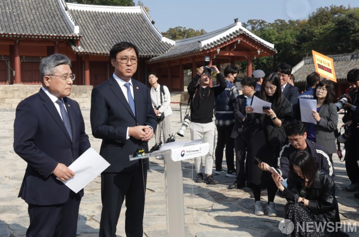 [서울=뉴스핌] 양윤모 기자 = 최휘영 문화체육관광부 장관이 7일 오후 서울 종묘 종묘 정전 상월에서 종묘 앞 개발 관련 대법원 판결에 대한 입장을 허민 국가유산청장이 배석한 가운데 발표하고 있다. 최 장관은 "취할 수 있는 모든 수단을 강구해 우리 문화유산을 지키는 일에 앞장서겠다"밝혔다. 대법원은 6일 서울시의 종묘 앞(세운4구역) 개발과 관련해 국가유산청(문체부)이 제기한 조례 무효 소송에서 문화유산 인근 규제를 완화한 조례 개정이 적법하다고 판결했다. 세운4구역 건물 최고 높이는 당초 종로변 55m, 청계천변 71.9m에서 종로변 101m, 청계천변 145m로 변경됐다. 2025.11.07 yym58@newspim.com