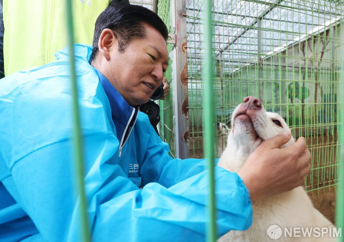 [용인=뉴스핌] 최지환 기자 = 정청래 더불어민주당 대표가 9일 오전 경기 용인시 동물보호단체 행강의 유기견 보호소를 찾아 강아지들과 인사하고 있다. 2025.11.09 choipix16@newspim.com