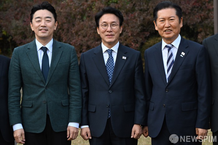 [서울=뉴스핌] 최지환 기자 = 강훈식 대통령실 비서실장, 김민석 국무총리, 정청래 더불어민주당 대표가 9일 오후 서울 종로구 국무총리공관에서 열린 고위당정협의회에 앞서 기념촬영을 하고 있다. 2025.11.09 choipix16@newspim.com