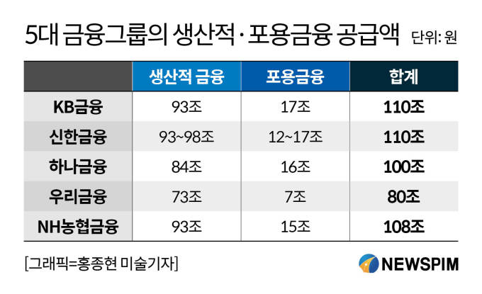 이들은 정부의 '생산적·포용금융 확대' 기조에 맞춰 2030년까지 총 508조원 공급을 목표로 세웠다. 가장 먼저 우리금융이 80조원 투입 계획을 발표했고, 이어 하나금융(100조원), NH농협금융(108조원), KB금융(110조원), 신한금융(110조원)이 차례로 계획을 내놨다. 이 중 생산적 금융 공급액을 따져보면 KB금융은 93조원을, 신한금융은 93~98조원을 배치했으며 하나금융 84조원, 우리금융 73조원, NH농협금융은 93조원 규모다.